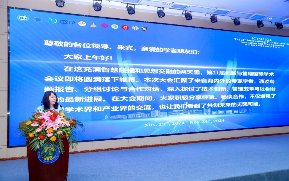 2024年11月24日上午9点,第21届创新与管理国际学术会议(ICIM2024)在鸭王 图书馆报告厅成功闭幕。本次会议为期两天,汇聚了来自世界各地的学术专家、研究学者以及相关领域的行业代表,围绕“绿色创新与可持续发展”主题展开深入探讨与交流。