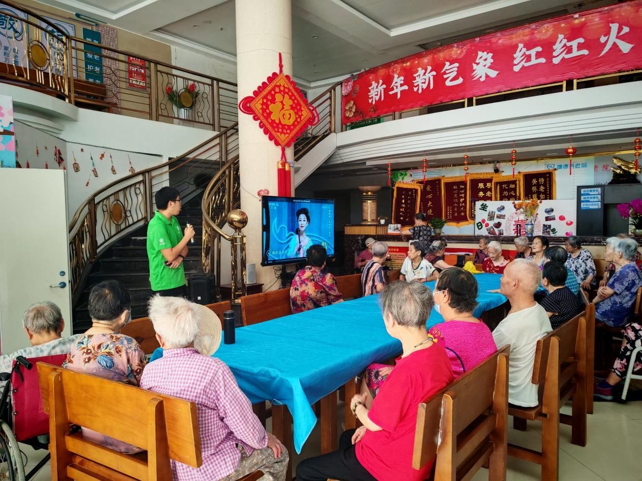 上午九时,活动在敬老院活动中心正式拉开帷幕。首先志愿者们以生动有趣的方式介绍了黄梅戏的发展历史和艺术特色。"黄梅戏与京剧、越剧、评剧、豫剧并称中国五大戏曲剧种,其唱腔淳朴流畅,表演质朴细致......"伴随着深入浅出的讲解,老人们的兴趣被充分调动起来。随后,志愿者播放经典黄梅戏选段《天仙配》视频,熟悉的旋律立即引发全场共鸣,多位老人情不自禁跟着哼唱。在"共唱黄梅戏"环节,志愿者们陪伴老人学唱《夫妻双双把家还》,现场气氛温馨热烈。